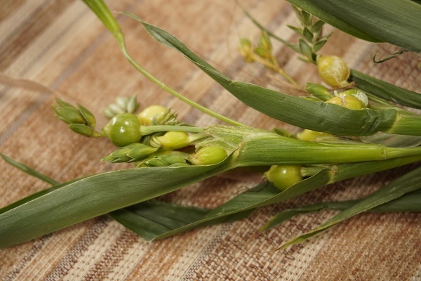 川辺にそよぐ草の間に光を集めるのは、色づいた数珠玉の実たち。